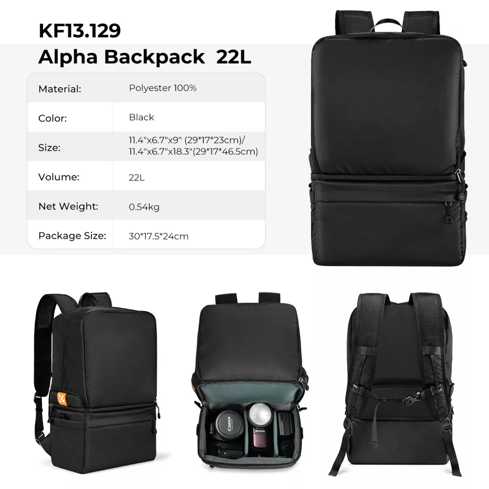 K&F Concept Collapsible Backpack 22L, fotós hátizsák, oldaltáskáva csukható, fekete (KF-13-129)
