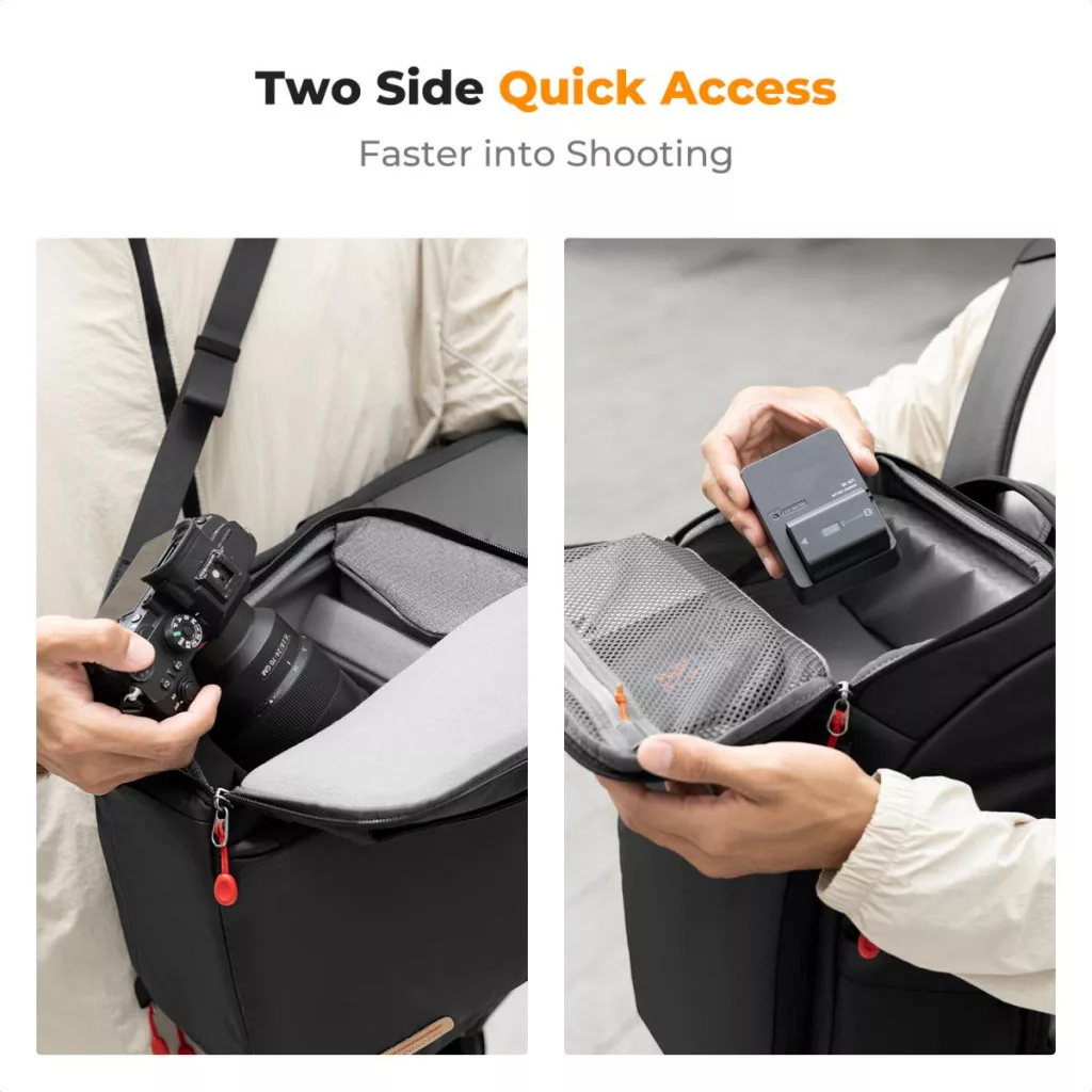 A K&F Alpha hátizsák nem csak fotósoknak készült - praktikus társaid lehet a mindennapi kalandok során is. A nagy kapacitású rekeszekben bőven van hely személyes tárgyaknak, például ruházatnak, ételnek vagy bármi másnak, amit egy hosszabb túrán vagy utazáson szükséges lehet magaddal vinned. A két oldalzseb különösen alkalmas vizespalackok vagy állvány tárolására, míg a hátizsák több pontján elhelyezett hevederek és pántok segítségével a kisebb tárgyakat is könnyen rögzítheted.