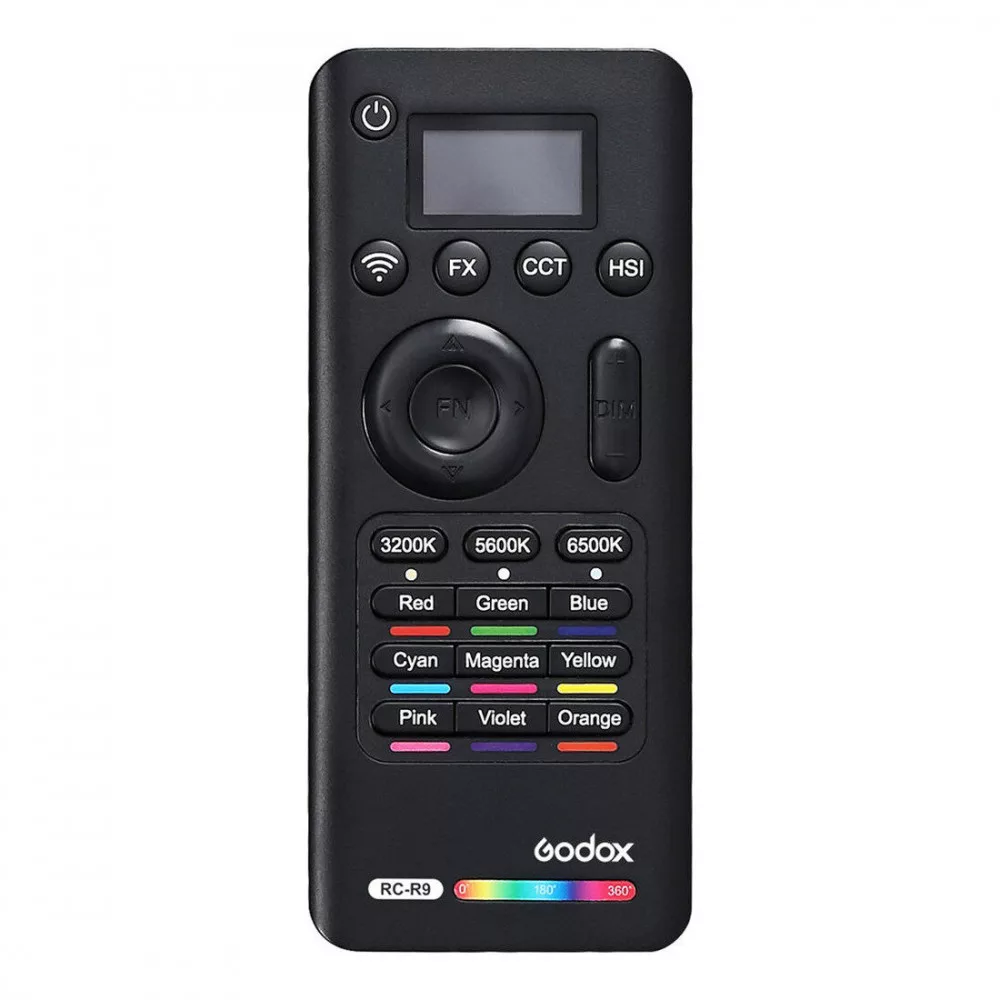 Steuern Sie den Godox RGB LEDs aus der Ferne mit der Godox RC-R9 Fernbedienung. Sie können die Farbe und Helligkeit des Leuchtstabs mit der 2,4-GHz-Fernbedienung einstellen. Die Fernbedienung verfügt über 32 Kanäle und 16 Gruppen.