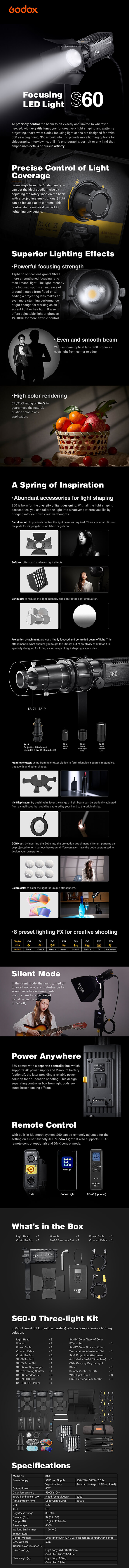 Mit einem eingebauten Bluetooth-System kann der S60 für die Einstellung in der benutzerfreundlichen "Godox Light" -App aus der Ferne angepasst werden. Es unterstützt auch die optionale drahtlose Fernbedienung RC-A6.