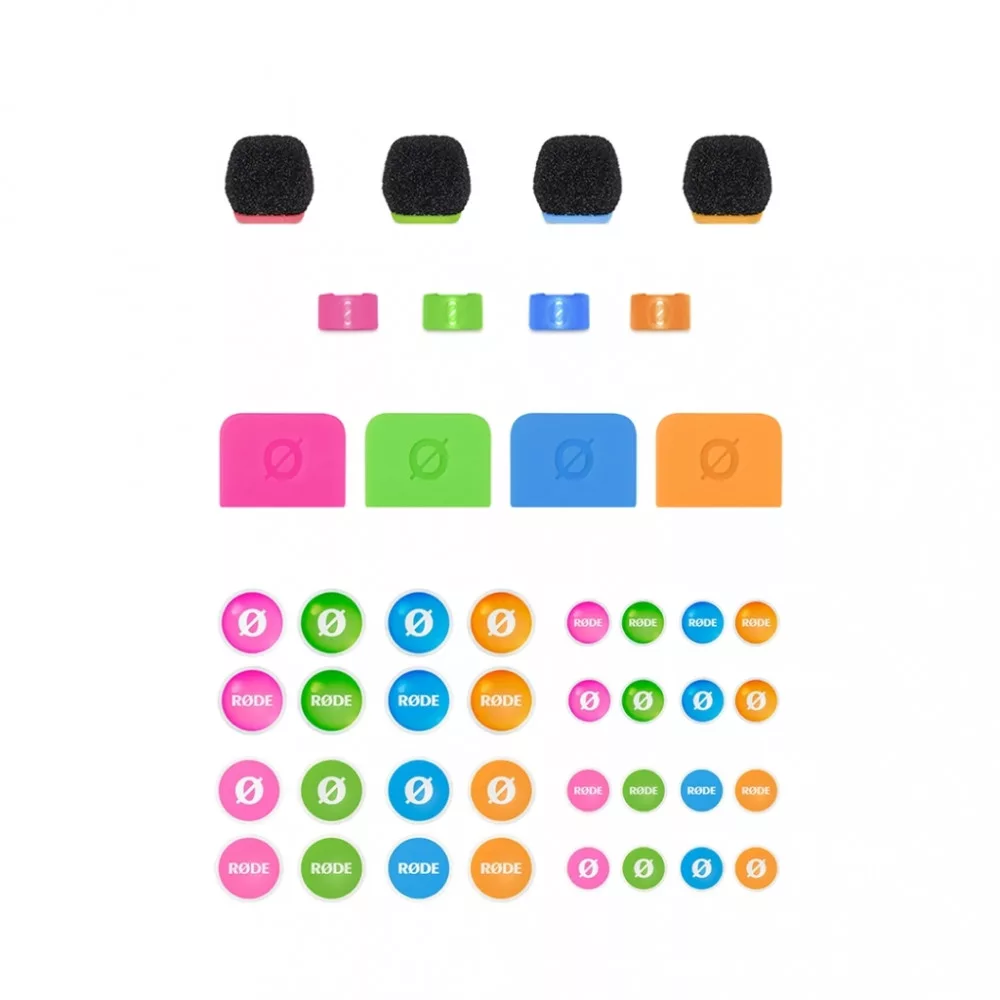 COLORS 3 ist ein Set aus vier farbigen Windschutzscheiben, Kabelidentifikationsringen, Anhängern und einem Aufkleberset für RØDE Wireless GO, Wireless GO II und Lavalier II, die das Identifizieren von Kanälen in Konfigurationen mit mehreren Mikrofonen erleichtern.
